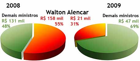 O ex-presidente do Tribunal de Contas da União (TCU) Walton Alencar Rodrigues recebeu R$ 253.452,70 em diárias nos dois anos (2007-2008) em que comandou o órgão responsável pela fiscalização de recursos públicos na administração federal. Os gastos do ex-presidente são quase seis vezes superiores aos registrados por seu antecessor, o ex-ministro Adylson Motta. Durante os dois anos em que dirigiu o TCU, Adylson recebeu R$ 44.228,40 para custear despesas em viagens nacionais e internacionais.