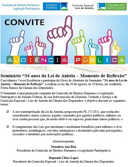 6 Comentários do post " Seminário: “34 anos da Lei de Anistia – Momento de Reflexão”, Senado Federal e Câmara dos Deputados "