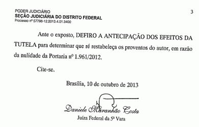 No DOU 208 desta sexta-feira, 25/10/2013, na Seção 1 página 47 publica 01 portaria restabelecendo anistia por conta de decisão liminar da 5ª VF/DF.