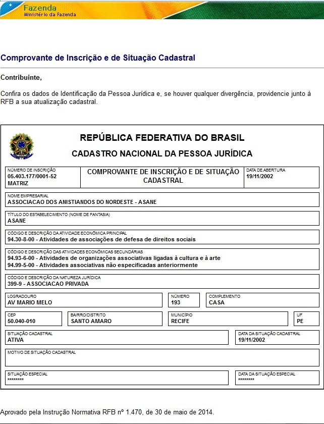 Como pedes, segue abaixo os dados da Conta Bancária da ASANE e do nosso CNPJ, fins sua confirmação para daí proceder a doação através de depósito bancário.