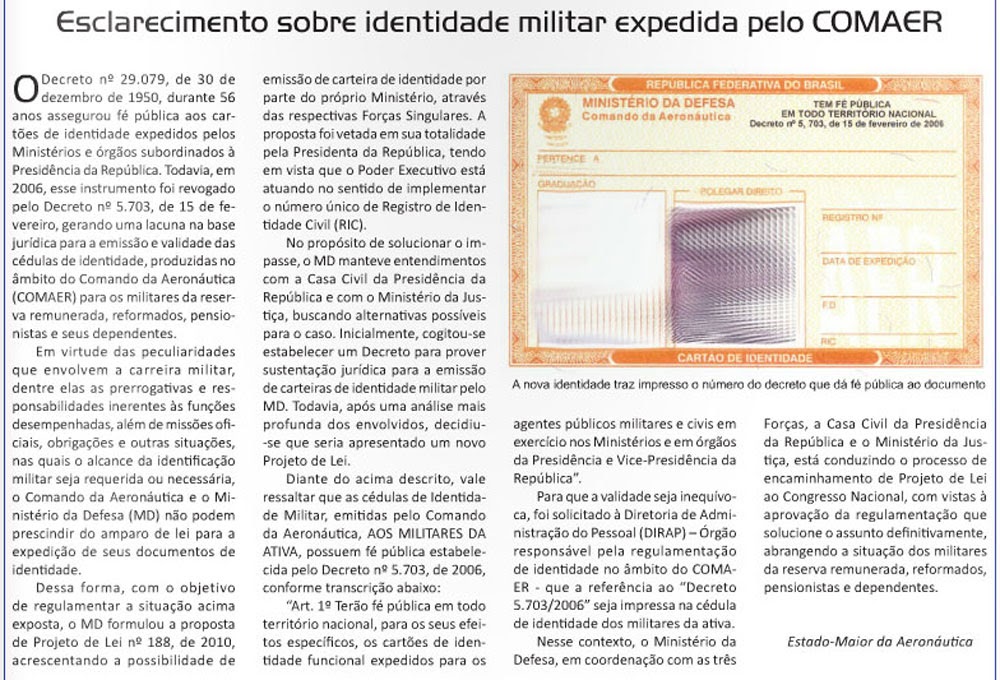 Esta semana fui sacar uma certa quantia na agência do Banco do Brasil, agência onde possuo a minha conta corrente, e ao apresentar a minha carteira de identidade da Aeronáutica para o referido saque fui informado pela funcionária ao dizer que a nossa carteira de identidade da Aeronáutica não tem mais validade de acordo com o novo decreto lei. Ela me perguntou se eu já tinha providenciado outra carteira de identidade; falei pra ela que tal informação tinha me causado grande surpresa porque a Aeronáutica não tinha me informado nada a respeito.