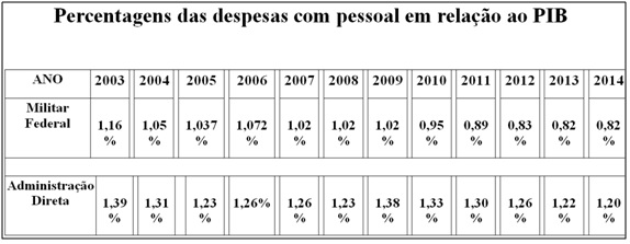 Em 2003, as despesas com o pagamento do pessoal militar federal equivaliam a 1,16% do PIB; em 2014, essa relação passou a ser de 0,82% do PIB.