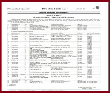 ?   PAUTA – No DOU nº 120, desta segunda-feira, dia 26/06/2017, na Seção 1, página 27 publica pauta de julgamento no Plenário da CA/MJSP.