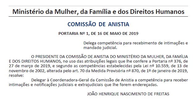 Delegar à Coordenadora-Geral da Comissão de Anistia a competência para receber intimações e notificações judiciais e extrajudiciais que lhe forem endereçadas.JOÃO HENRIQUE NASCIMENTO DE FREITAS