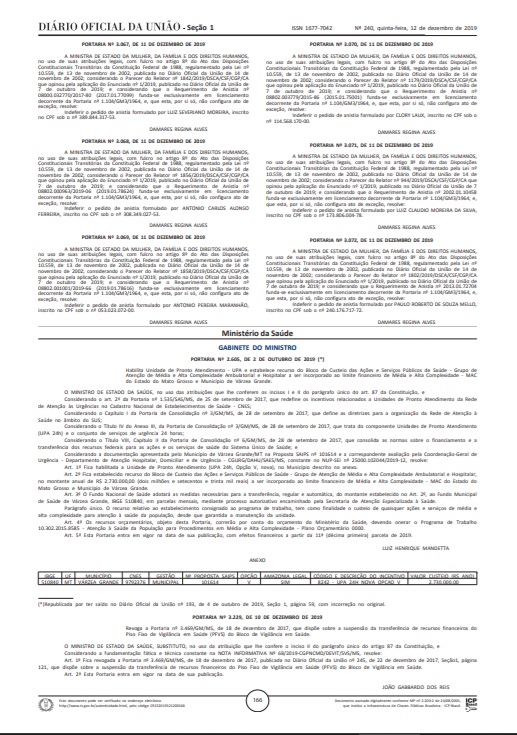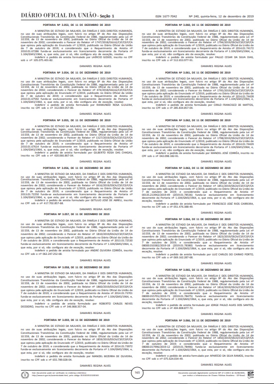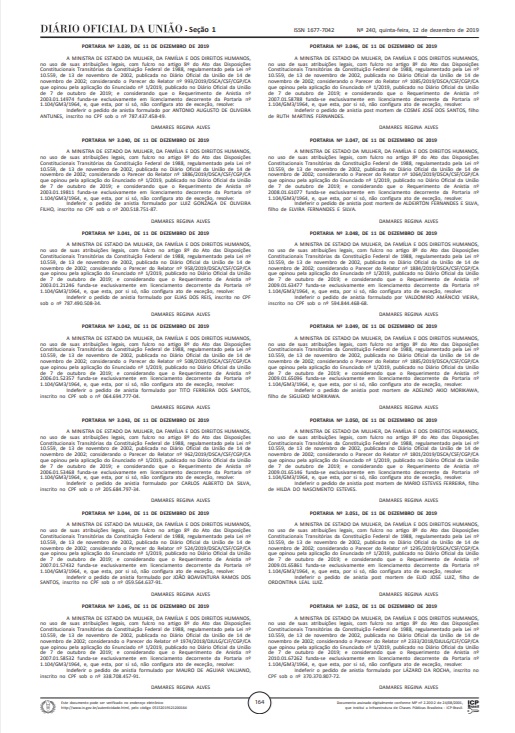 ★ No DOU nº 239 desta quarta-feira, dia 11/12/2019, na Seção 1, página 167, publica as portarias nº 3.035 e 3.036 indeferindo requerimentos de anistia de 2011 e 2013, cujos autores cobraram na Justiça o julgamento de seus pedidos.