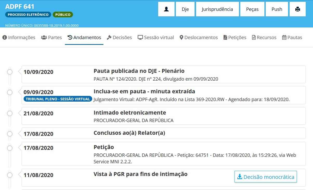 Segue abaixo, informação de Pauta da ADPF-641 de autoria do Nobre Adv. NEY MARQUES DOURADO FILHO, cujas alegações contidas no Agravo Regimental – Petição: 62646 impetrado será apreciado pelo Plenário Virtual do STF, no próximo dia 18/09/2020.