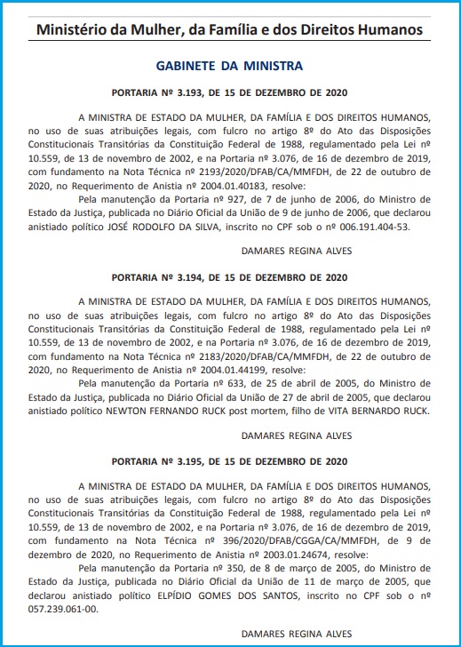 A MINISTRA DE ESTADO DA MULHER, DA FAMÍLIA E DOS DIREITOS HUMANOS, no uso de suas atribuições legais, com fulcro no artigo 8º do Ato das Disposições Constitucionais Transitórias da Constituição Federal de 1988, regulamentado pela Lei nº 10.559, de 13 de novembro de 2002, e na Portaria nº 3.076, de 16 de dezembro de 2019, com fundamento na Nota Técnica nº 2183/2020/DFAB/CA/MMFDH, de 22 de outubro de 2020, no Requerimento de Anistia nº 2004.01.44199, resolve: Pela manutenção da Portaria nº 633, de 25 de abril de 2005, do Ministro de Estado da Justiça, publicada no Diário Oficial da União de 27 de abril de 2005, que declarou anistiado político NEWTON FERNANDO RUCK post mortem, filho de VITA BERNARDO RUCK. DAMARES REGINA ALVES