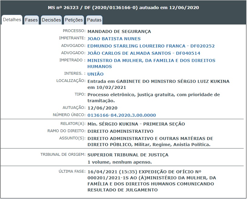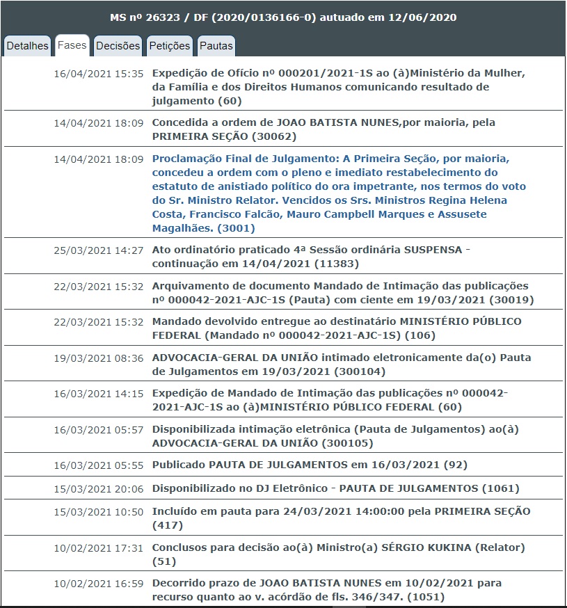 DECISÃO EM ACÓRDÃO – A decisão de mérito foi concedida na Primeira Turma do STJ pelo Ministro SÉRGIO KUKINA – Relator, ao ex-Cabo da FAB – JOÃO BATISTA NUNES, que teve a anistia política anulada em 5 de junho de 2020.