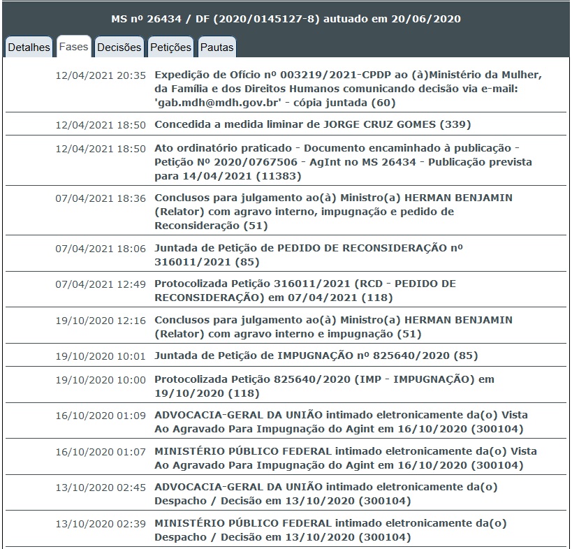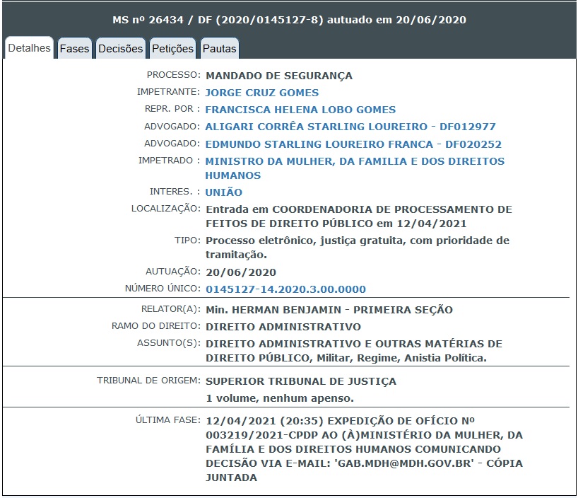 Liminar concedida no STJ pelo Ministro HERMAN BENJAMIN, nos autos do MS 26.434-DF, ao ex-Cabo da FAB – JORGE CRUZ GOMES, representado por FRANCISCA HELENA LOBO GOMES, que teve sua anistia política anulada pelo MMFDH em 05/06/2020.