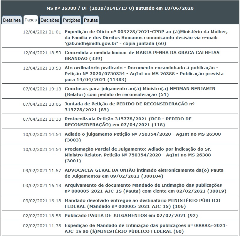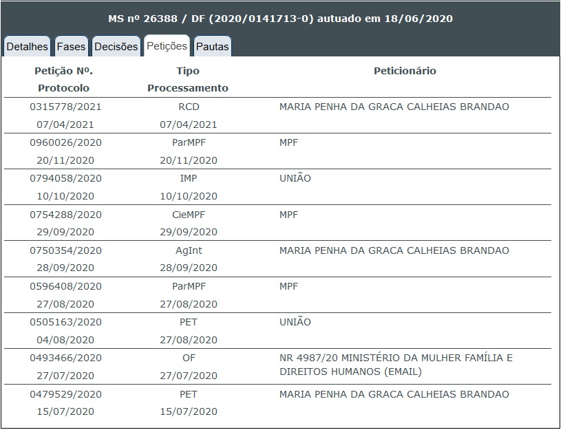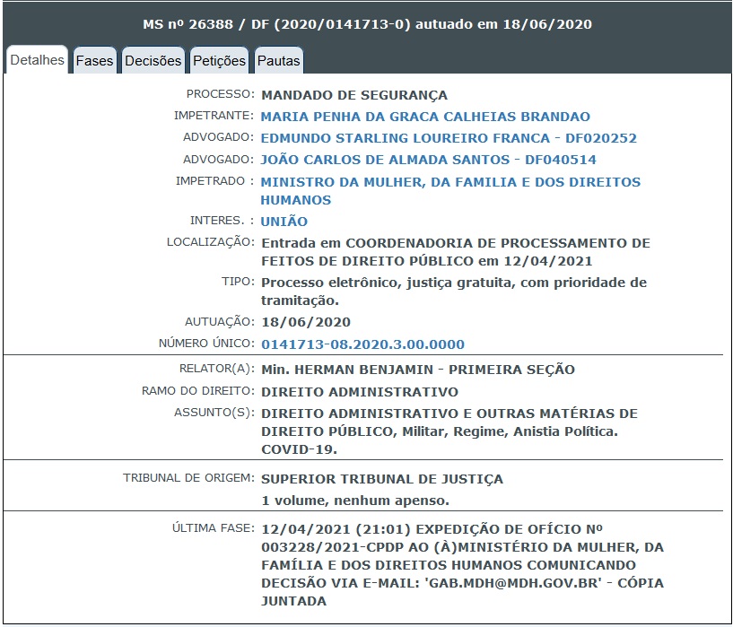 Liminar concedida no STJ pelo Ministro HERMAN BENJAMIN, nos autos do MS 26.388-DF, ao ex-Cabo da FAB – LUIZ DE GOES BRANDÃO, representado por MARIA PENHA DA GRAÇA CALHEIAS BRANDÃO, que teve sua anistia política anulada pelo MMFDH em 05/06/2020.