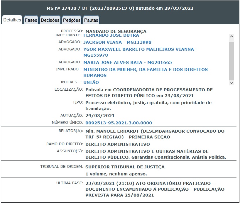 » À quem interessar possa conhecer e confirmar… Decisão LIMINAR concedida dia (23/08) no STJ pelo Ministro MANOEL ERHARDT (Desembargador Convocado do TRF-5ª Região) ao ex-Cabo (Pré/64) FERNANDO JOSÉ DUTRA restaurando sua anistia política PORTAL DOS CABOS DA F.A.B. Atingidos Pela Portaria nº 1.104GM3/64: Um ato de exceção de natureza exclusivamente político.