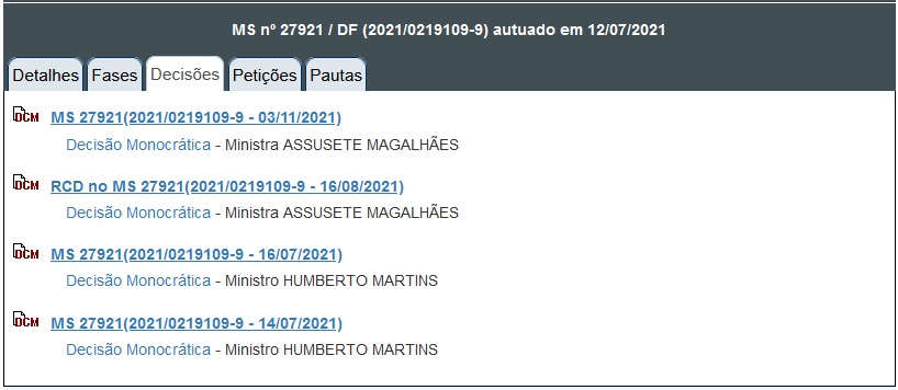 Na mesma linha, outros julgados: STJ, MS 27.601/DF, Rel. Ministra ASSUSETE MAGALHÃES, PRIMEIRA SEÇÃO, DJe de 29/06/2021; MS 26.431/DF, Rel. Ministra ASSUSETE MAGALHÃES, PRIMEIRA SEÇÃO, DJe de 29/06/2021; MS 26.313/DF, Rel. Ministra ASSUSETE MAGALHÃES, PRIMEIRA SEÇÃO, DJe de 29/06/2021; MS 26.146/DF, Rel. Ministra ASSUSETE MAGALHÃES, PRIMEIRA SEÇÃO, DJe de 29/06/2021; MS 25.797/DF, Rel. Ministra ASSUSETE MAGALHÃES, PRIMEIRA SEÇÃO, DJe de 29/06/2021.